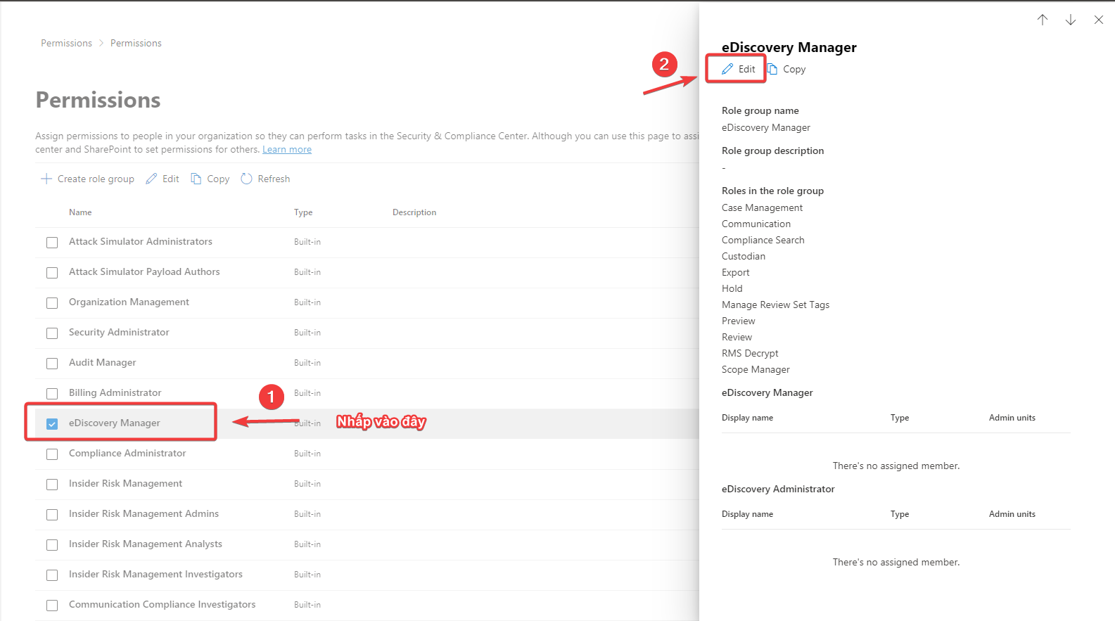 B4 : Tick chọn mục eDiscovery Manager --> Chọn Edit